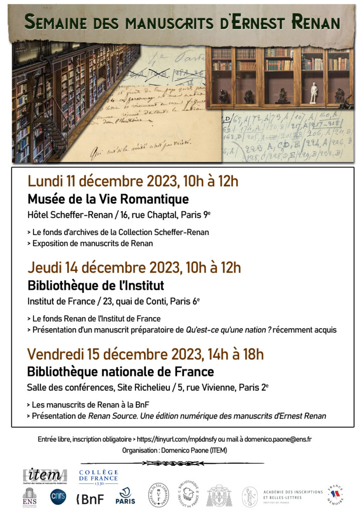Dans le cadre des célébrations du bicentenaire de la naissance d’Ernest Renan, l’Institut des textes et manuscrits modernes (ITEM), en collaboration avec la BnF, la Ville de Paris, le Musée de la…